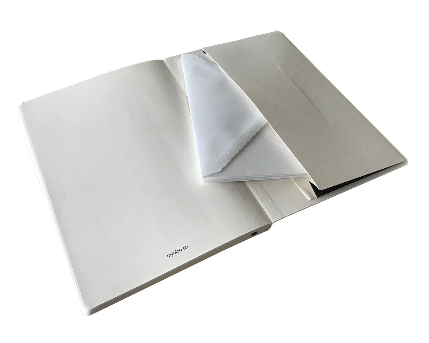 Notizbuch im Format A5 mit schwarzem Balacronumschlag und graviertem ELCO-Schriftzug auf der Rückseite. Die Vorderseite kann mit Text graviert und die Position der Gravur von Ihnen gewählt werden.