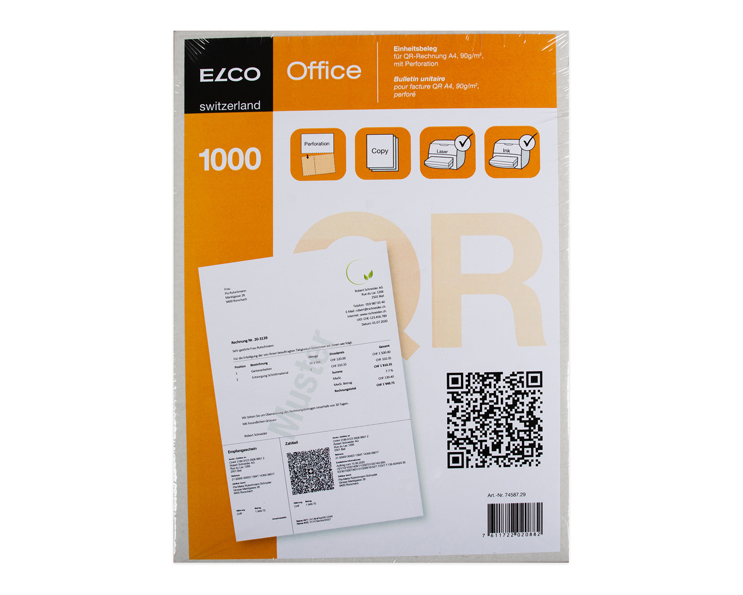 QR-Einzahlungsschein A4 mit Perforation für Empfangsschein und Zahlteil. Schachtel mit 1000 Blatt 90 g/m². Geeignet für Laser-, Farblaser- oder Inkjetdrucker.