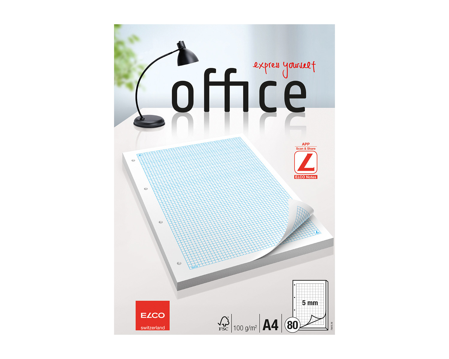 Satinierter 80-Blatt Ringbucheinlagenblock A4 mit blauer Lineatur, 5mm kariert mit Rahmen, 4-fach gelocht und in 100 g/m²-Ausführung. Mit "L"-Symbolen für die Verwendung mit der "ELCO Notes"-App.