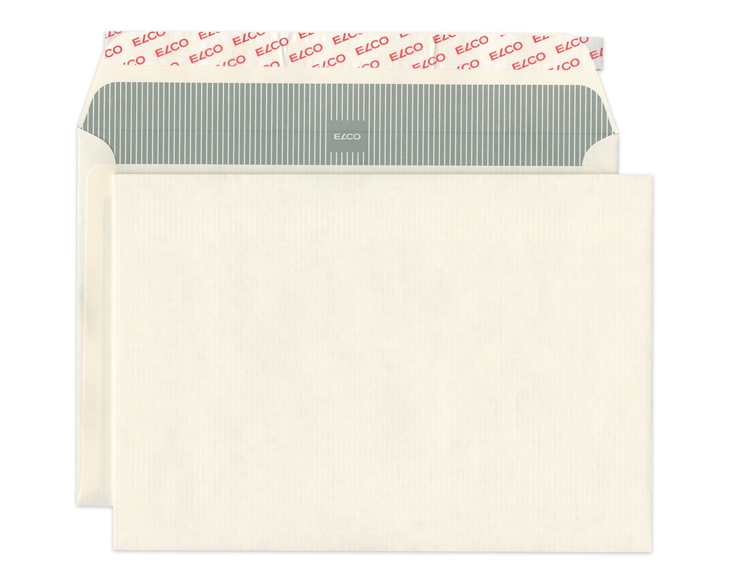 100% Recyclingpapier, Optifix-Haftklebeverschluss und Innendruck grau gestreift.