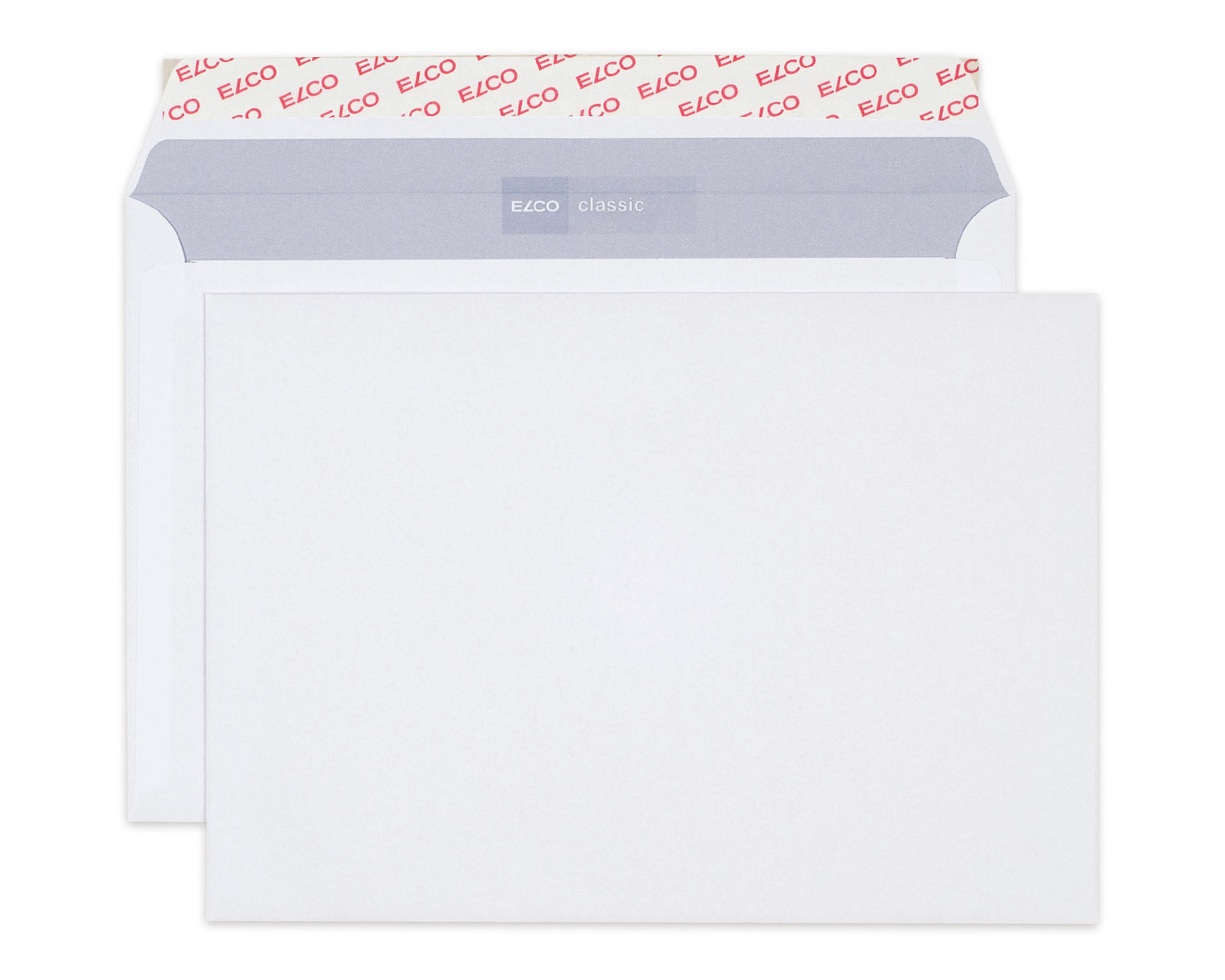 Weiss mit Innendruck "ELCO classic" und Haftklebeverschluss, FSC-Papier.