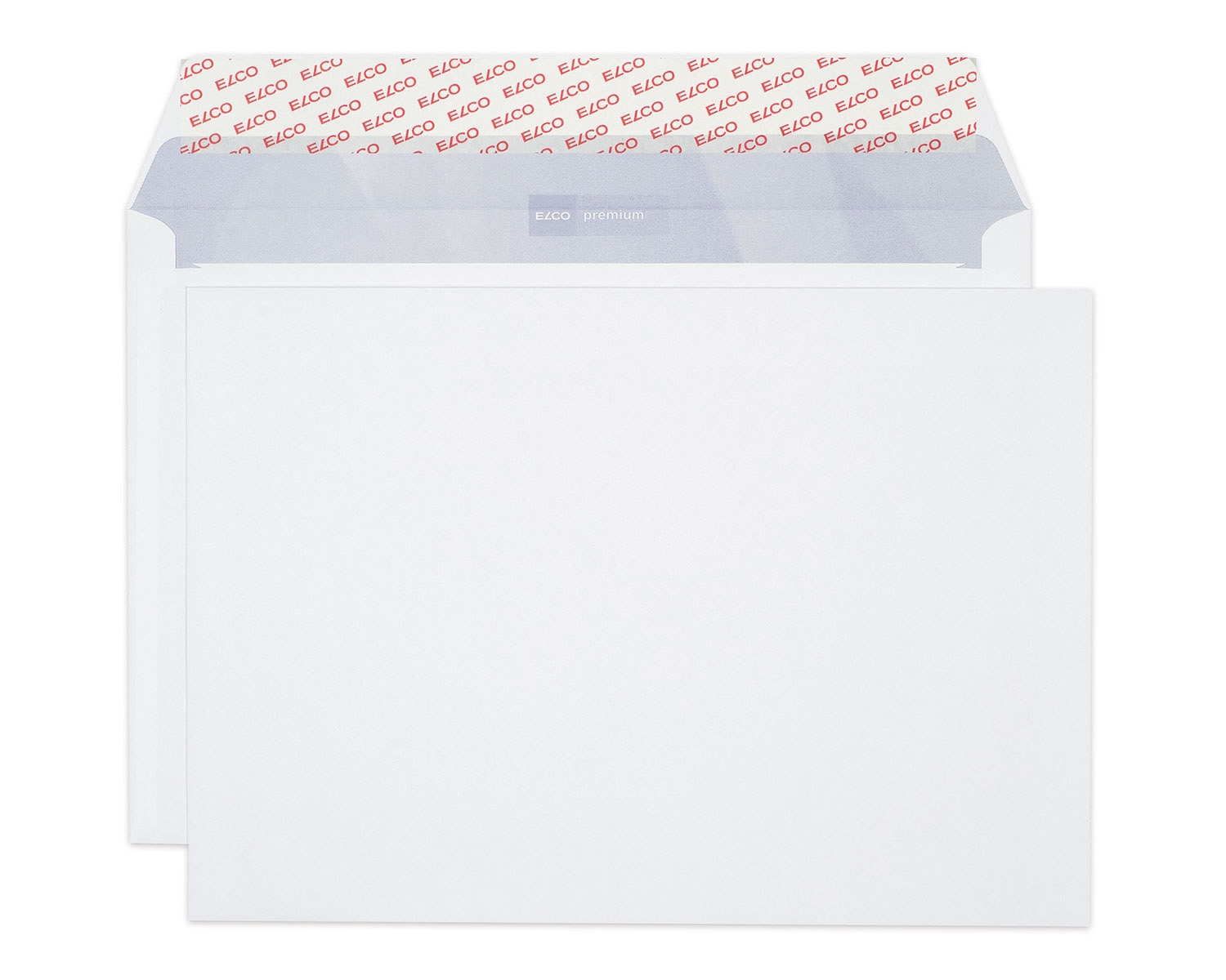 Hochweisses Premium C4-Kuvert, 100 g/m², ohne Fenster, mit Haftklebeverschluss in der praktischen 250 Stk. Entnahme-Schachtel. Innendruck "ELCO premium". FSC. Top Qualität aus der Schweiz.