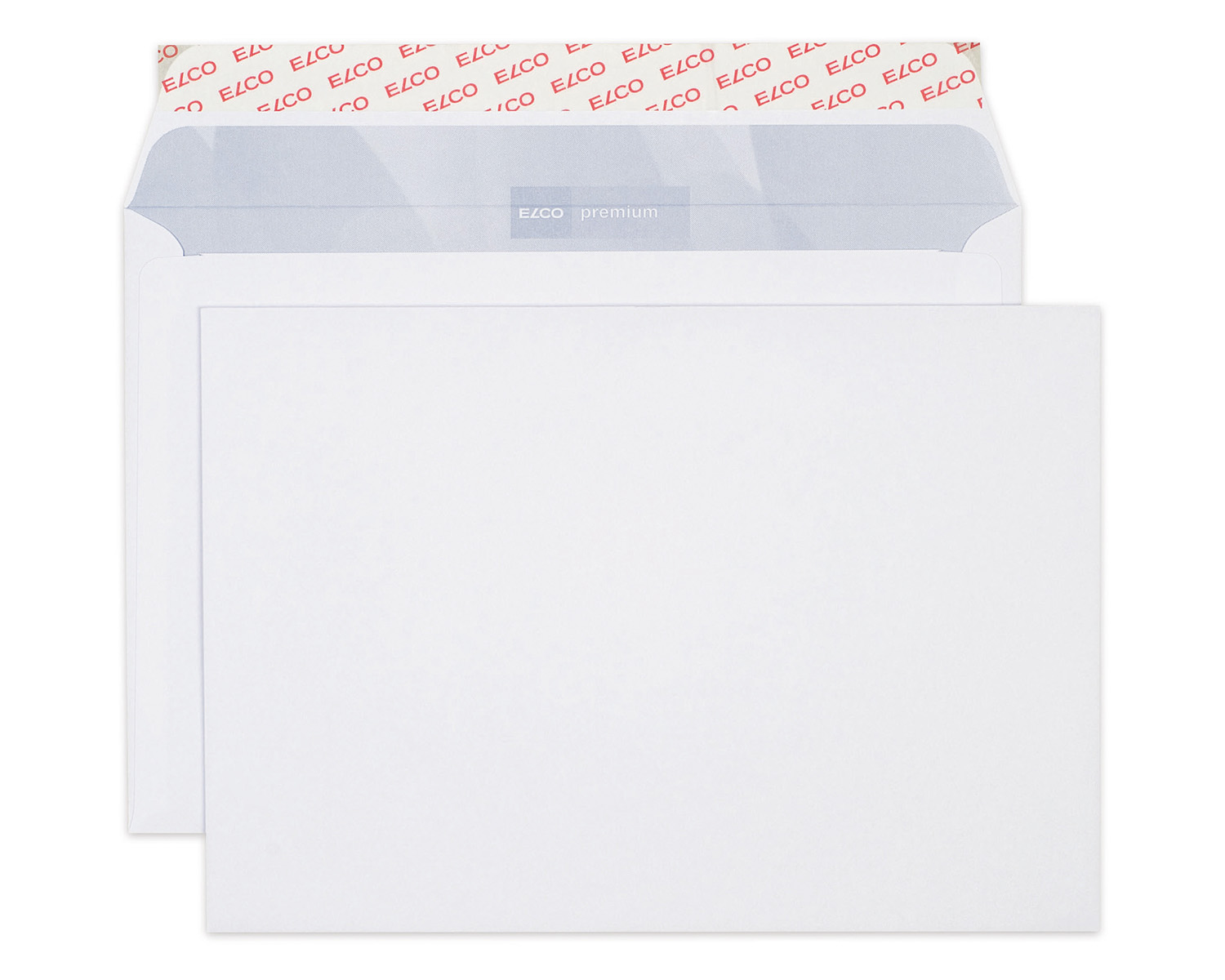 Hochweisses Premium B5-Kuvert von ELCO ohne Fenster mit Haftklebeverschluss in der 500 Stk.-Box. Mit Innendruck "ELCO premium". Spitzenqualität aus der Schweiz.