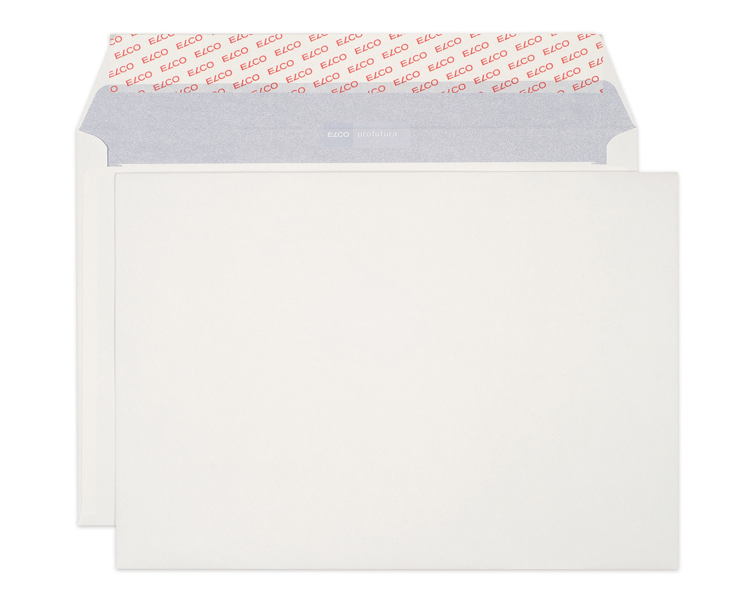 Naturweisses Profutura C4-Kuvert von ELCO ohne Fenster mit Haftklebeverschluss in der 250 Stk.-Box. 100% recycling. 100% chlorfrei. Innendruck "ELCO profutura".