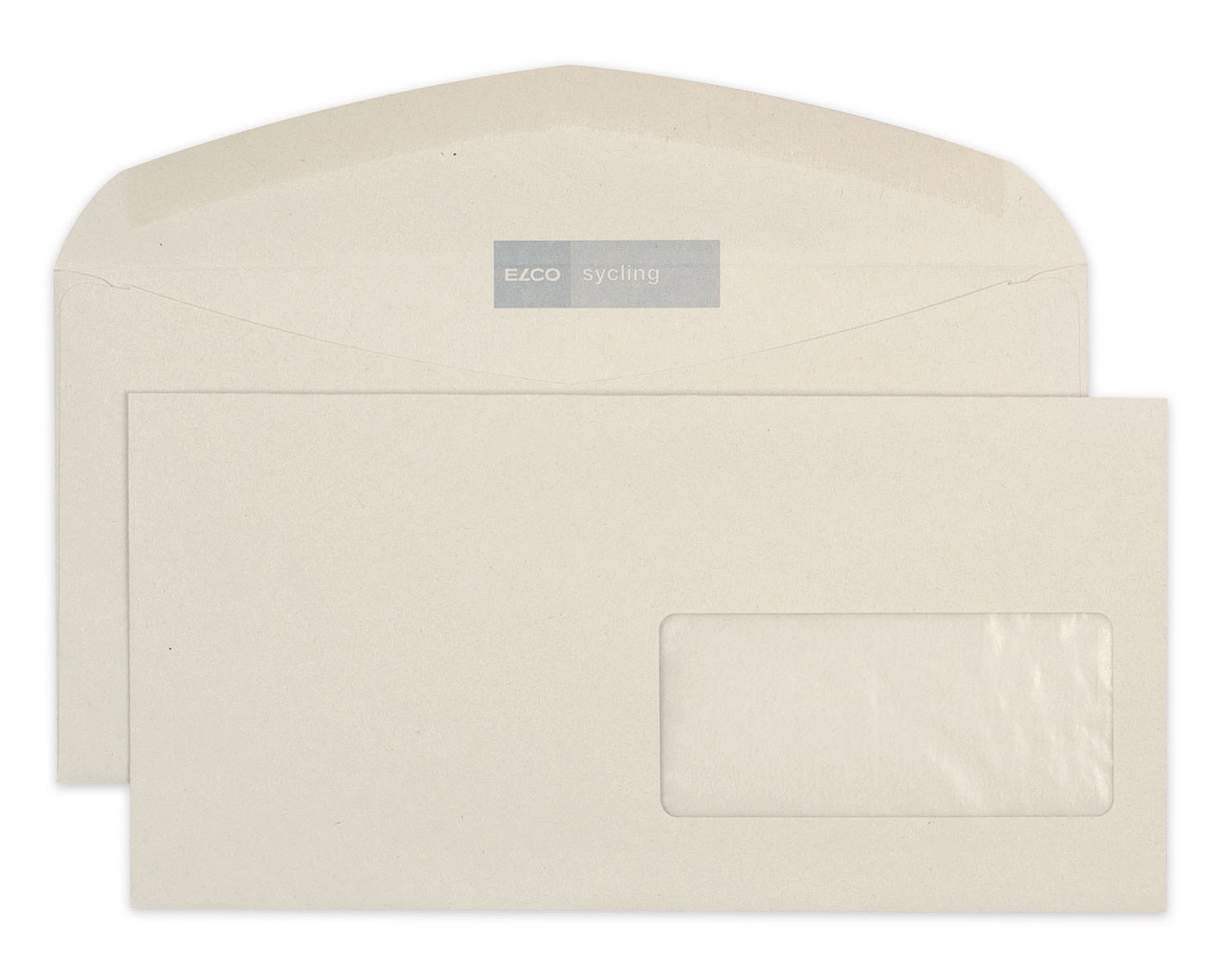 C5/6-Couvert, 100g/m², grau, mit Pergaminfenster rechts und Nassklebeverschluss. Innendruck "ELCO sycling" in der praktischen Entnahme-Schachtel. 100% chlorfrei, 100% Recycling. Blauer Engel.