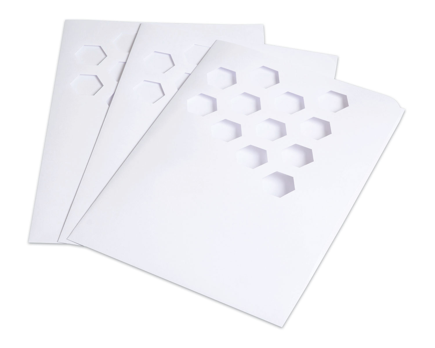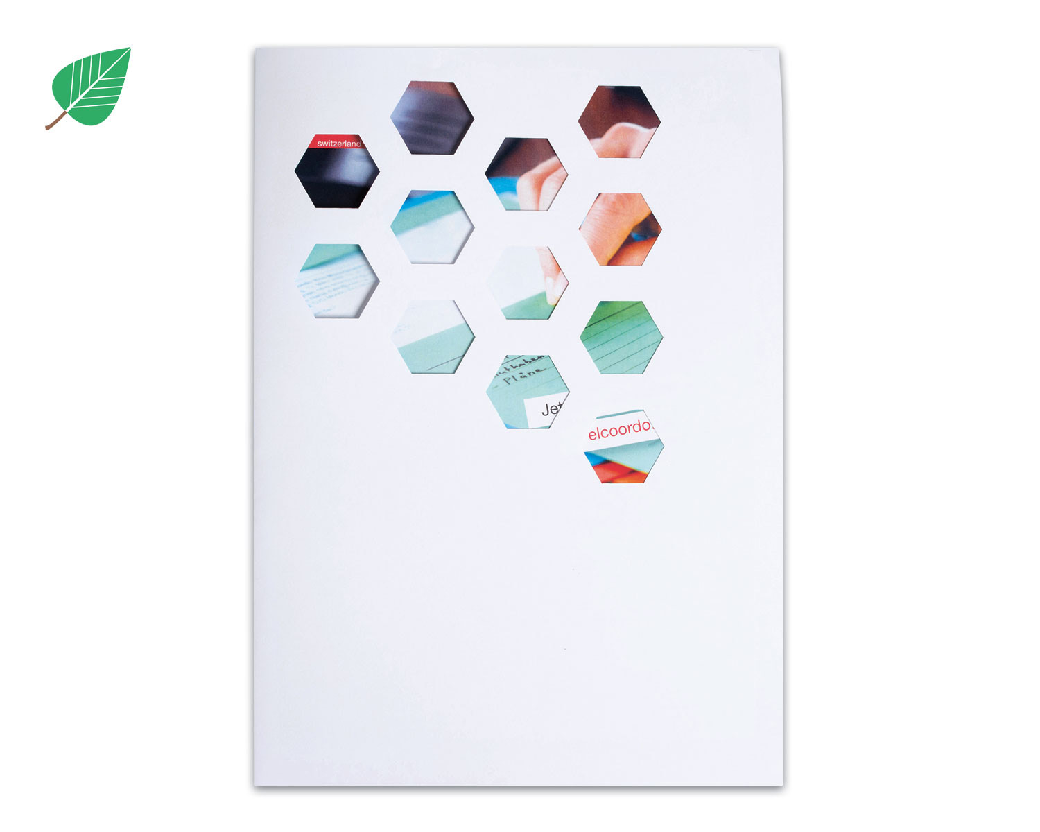 100 Stk. weisse Mappen mit Fenster-Ausstanzungen in Wabenform. Ökologische Dokumentenmappe ohne Plastik.