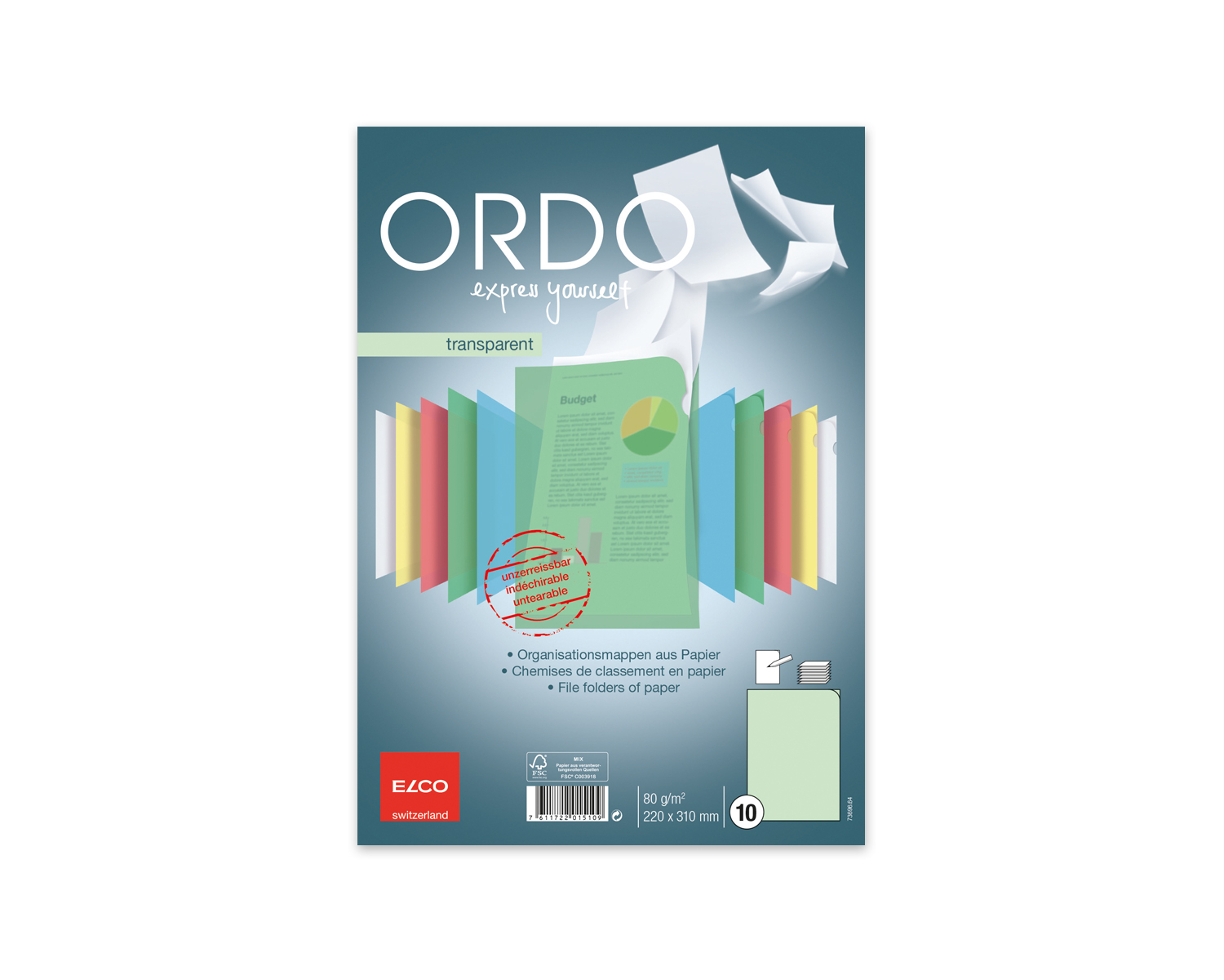 10 Stück Ordo grün-transparent für A4, 80 g/m². Die Farbe der Hülle ermöglicht Ihnen eine Sortierung Ihrer Unterlagen. Das unzerreissbare Ordo. Dank dem reissfesten und durchsichtigen Papier ist dieses Ordo eine ökologisch sinnvolle Alternative zu herkömmlichen Plastikmäppchen.