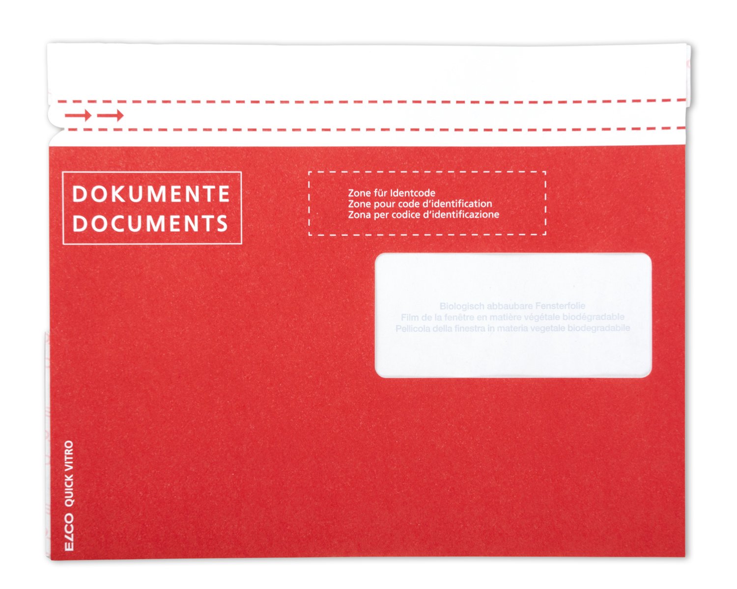 1 Karton à 250 Stk., biologisch abbaubares Fenster rechts, mit rotem Aufdruck „Dokumente“ und 2-fachem Haftklebeverschluss. Zum Anbringen von Dokumenten auf Paketen, Versandtaschen und Päckchen. Zudem ermöglicht die Perforation ein leichtes Öffnen ohne die enthaltenen Dokumente zu beschädigen. Die neue und nachhaltige Quick Vitro Dokumententasche aus Papier – für mehr Nachhaltigkeit in der Logistik!
