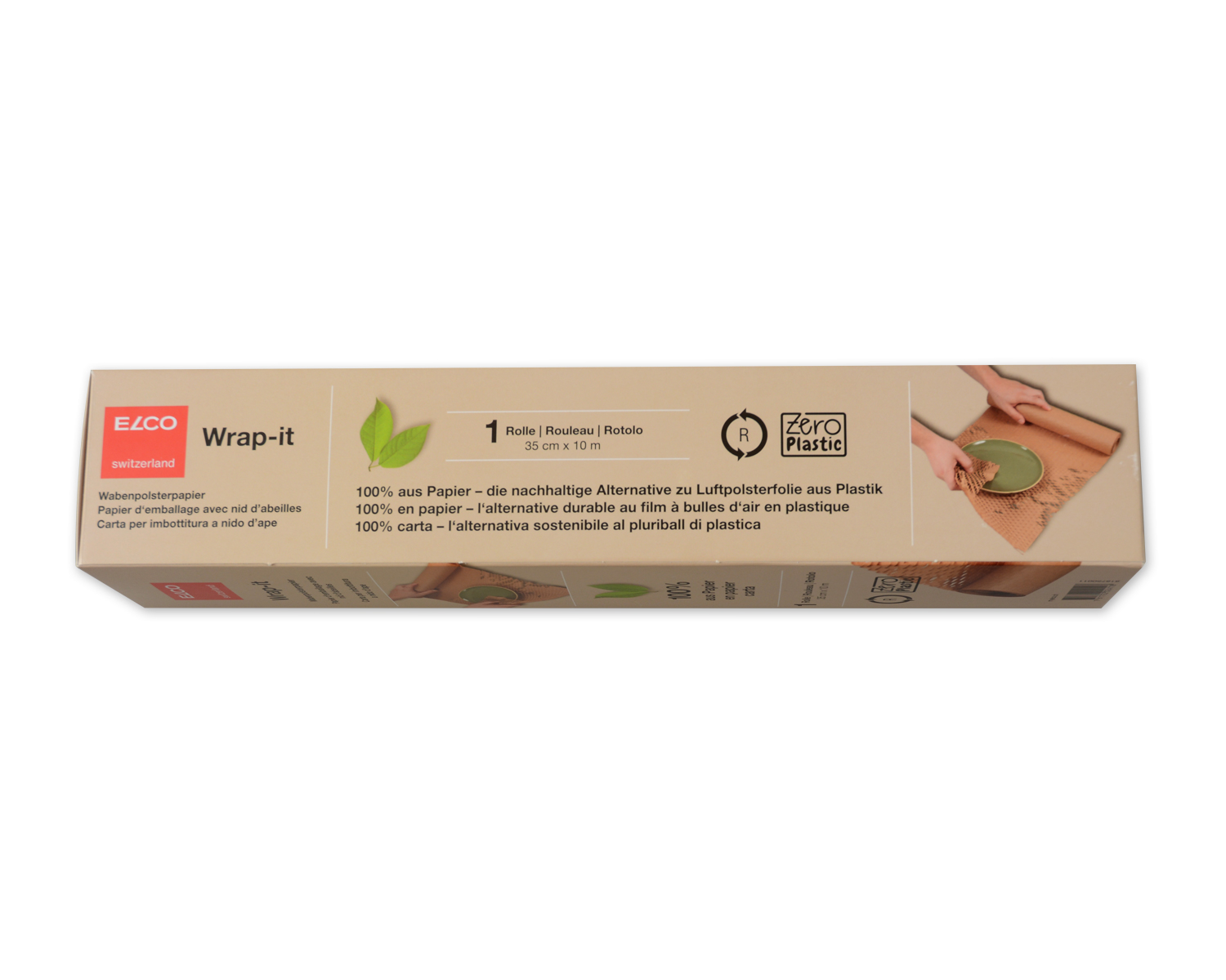 ELCO Wabenpolsterpapier Wrap-it aus 100% Papier – die nachhaltige Alternative zu Luftpolsterfolie aus Plastik. Dank der Wabenstruktur des Papiers, welche sich beim auseinanderziehen zeigt, sind die darin eingewickelten Produkte perfekt geschützt. Umwickeln sie den gewünschten Gegenstand mit mehreren Schichten und legen sie ihn in einen Karton oder Behälter.